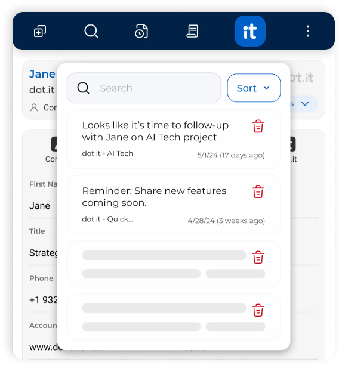 Save hours of digging through conversations with dot.it AI's ability to recall specific details, provide next steps, and AI Reply.